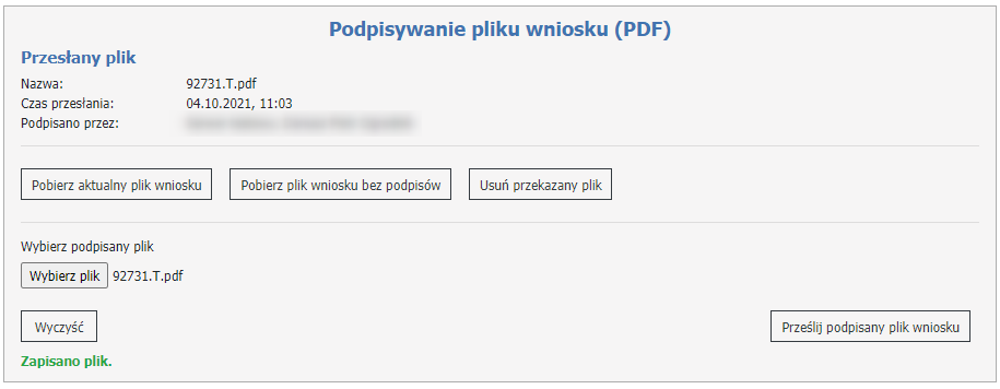 Informacja o przesłanym pliku pojawi się w sekcji Podpisywanie pliku wniosku. Składa się ona z nazwy, czasu przesłania oraz danych osób/osoby, przez które będzie on podpisany.