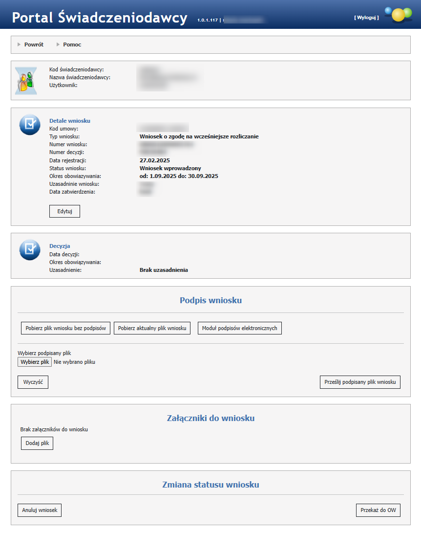W części Detale wniosku znajduje się kod umowy, typ wniosku, numer wniosku, numer decyzji, data rejestracji, status wniosku (możliwe statusy: Wniosek wprowadzony, Wniosek przekazany do OW NFZ, Wniosek pozostawiony bez rozpoznania, Wniosek anulowany, Wniosek rozpatrywany, Decyzja negatywna, Decyzja pozytywna), uzasadnienie wniosku, data zatwierdzenia.