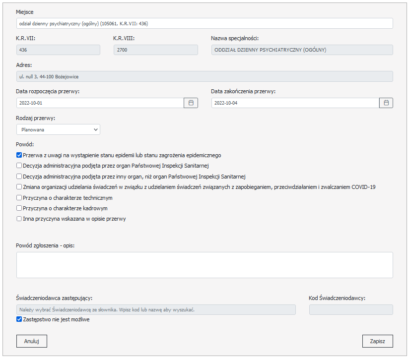 •Świadczeniodawca zastępujący (Zastępstwo nie jest możliwe): należy wskazać zastępstwo, jeżeli we wnioskowanym okresie przerwy świadczeniodawca posiada co najmniej jeden