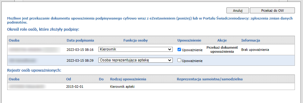 Podczas przekazywania eZestawienia do OW NFZ nastąpi sprawdzenie, czy osoby podpisane pod eZestawieniem mają aktualne upoważnienia na dzień podpisu. W przypadku ich braku wyświetli się komunikat o jego braku. Operator będzie mógł wprowadzić zmiany (np. dołączyć plik z upoważnieniem) lub zignorować je i przekazać eZestawnienie do OW NFZ.